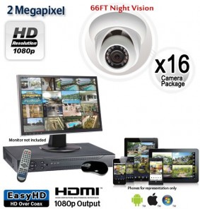 This 16 dome camera HD surveillance system provides amazing 2 megapixel video that is Full HD 1080p resolution for each camera. The cameras and HD DVR recorder in this system record Real Time in crisp and clear high definition 1080p (1920x1080 pixels), and the cameras offer 66ft of night vision in complete darkness. The cameras have a 3.6mm fixed lens that provides 80° angle of view. The HD outdoor dome cameras are vandal resistant and a perfect choice if you are mounting them where they may be in reach of passersby. The vandal proof camera is able to withstand slight blows and resist tampering. These small but rugged domes can be mounted on a ceiling or wall like a snail.